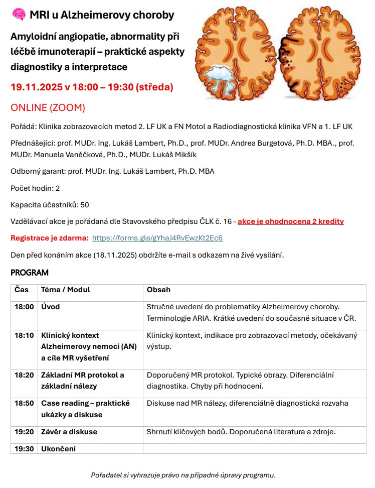 Přednášející: prof. MUDr. Ing. Lukáš Lambert, Ph.D., prof. MUDr. Andrea Burgetová, Ph.D. MBA., prof. MUDr. Manuela Vaněčková, Ph.D., MUDr. Lukáš Mikšík