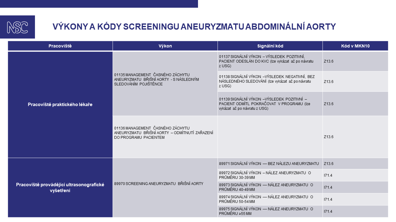 - Po splnění akreditace je možné nasmlouvat výkon screeningu AAA u příslušných zdravotních pojišťoven (Výkony a kódy screeningu aneurysmatu abdominální aorty).